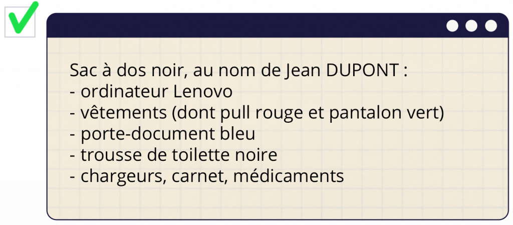 • Catégorie : choisissez le contenant, pas le contenu. Par exemple, si vous avez perdu un sac à dos avec à l’intérieur un ordinateur portable, choisissez la catégorie « sac à dos » (contenant)
