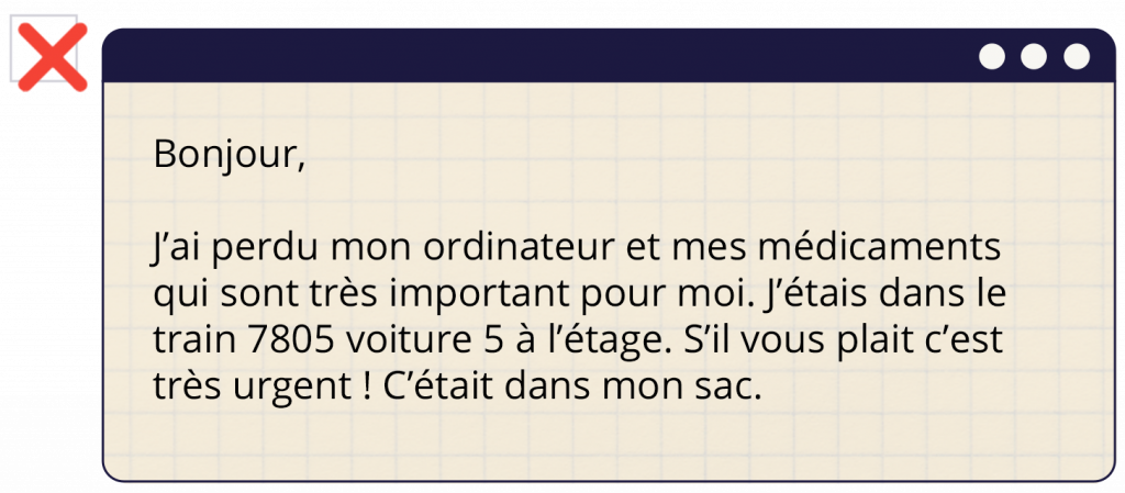 • Dans le cas contraire, rendez-vous au service des objets trouvés de la gare et déclarez la perte avec les agents